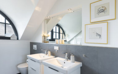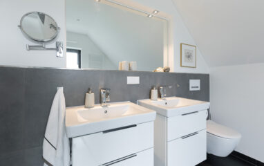 Das Masterbad mit 2 Waschbecken inkl. Unterbauschränken, großzügiger Badewanne, Dusche und WC bietet alle Annehmlichkeiten und ist direkt vom Schlafzimmer aus zu begehen.