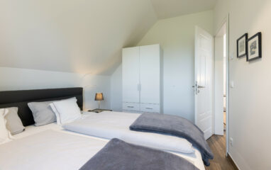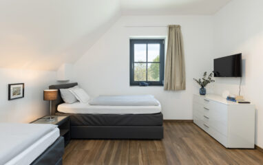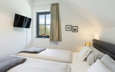 In diesem Zimmer stehen 2 Boxspring-Einzelbetten, die bei Bedarf auch zusammengeschoben werden können. Fernseher, unterfütterte Gardinen und ein Fliegenschutzgitter gehören wie in den anderen Schlafzimmern ebenso zur Ausstattung.