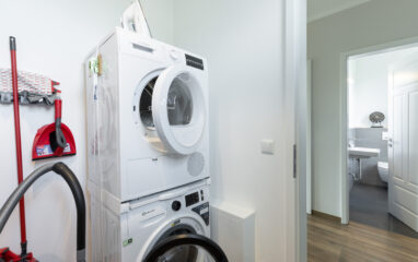 Hier stehen Waschmaschine und Trockner bereit; einen Staubsauger finden Sie ebenso vor wie Besen, Handfeger und Schaufel, Feudel, Eimer, Bügeleisen, Bügelbrett und einen Wäscheständer.