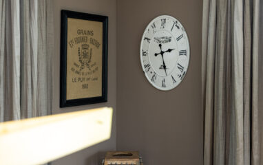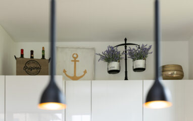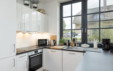 Eine Filterkaffeemaschine (Größe 4) sowie eine Nespresso-Kapselmaschine gehören zur Ausstattung, ebenso wie eine Mikrowelle und ein Wasserkocher. Liebevoll ausgewählte Accessoires sorgen für eine Wohlfühl- Atmosphäre. Eine Fensterhälfte ist mit einem Fliegenschutzgitter versehen.