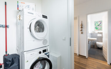 Hier stehen Waschmaschine und Trockner bereit; einen Staubsauger finden Sie ebenso vor wie Besen, Handfeger und Schaufel, Feudel, Eimer, Bügeleisen, Bügelbrett und einen Wäscheständer.