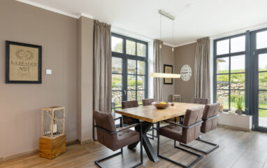 Großzügige Fensterfronten, ein komfortabler Esstisch mit 6 sehr bequemen Stühlen prägen diesen lichtdurchfluteten Bereich und laden zum gemeinsamen Essen und anschließenden Verweilen ein, denn auch von hier aus kann man das Kaminfeuer genießen.