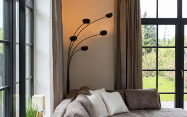 Unser Wohnbereich ist mit einer bequemen Sitzgarnitur eingerichtet. Deckenbeleuchtung und eine mehrarmige Stehlampe sorgen für eine Beleuchtung ganz nach Geschmack und Bedarf.