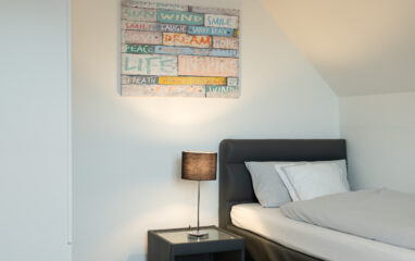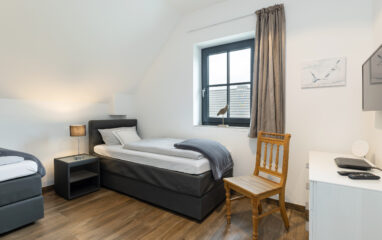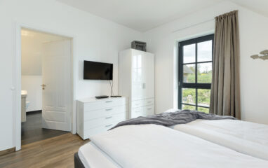 In diesem Zimmer stehen 2 Boxspring-Einzelbetten, die bei Bedarf auch zusammengeschoben werden können. Fernseher, unterfütterte Gardinen und ein Fliegenschutzgitter gehören wie in den anderen Schlafzimmern zur Ausstattung.