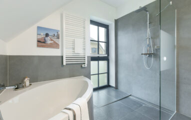 Eine Handtuchheizung sorgt auch hier für angenehm vorgewärmte Duschtücher und blickdichte Plissees an der Fenstergaube für ein ungestörtes Duschvergnügen.