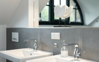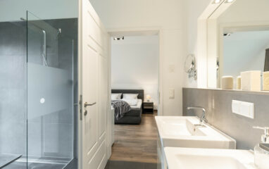 Das Masterbad mit 2 Waschbecken inkl. Unterbauschränken, großzügiger Badewanne, Dusche und WC bietet alle Annehmlichkeiten und ist direkt vom Schlafzimmer aus zu begehen.