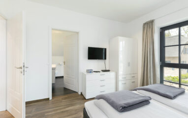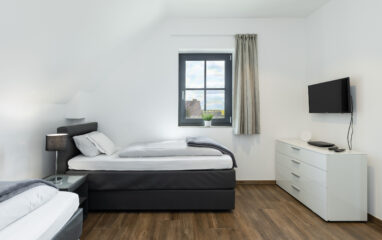 Im 3. Schlafzimmer stehen 2 Boxspring-Einzelbetten, die bei Bedarf zusammengeschoben werden können. Fernseher,verdunkelnde Gardinen und ein fest eingebautes Fliegenschutzgitter gehören auch hier zur Ausstattung.