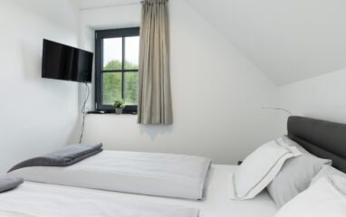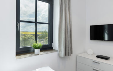 Die Gardinen sind mit einem Verdunkelungsstoff unterfüttert - für Gäste, die lieber abgedunkelt schlafen mögen und ein Fliegenschutzgitter sorgt auch bei geöffnetem Fenster für eine ungestörte Nachtruhe.