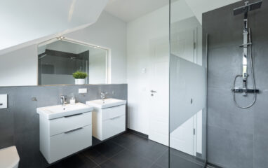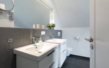 In diesem Bad finden Sie ebenfalls 2 Waschbecken mit Unterbauschränken, eine großzügige Dusche mit Glasabtrennung sowie ein WC.
