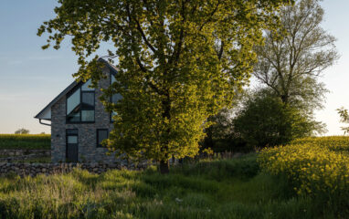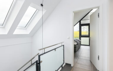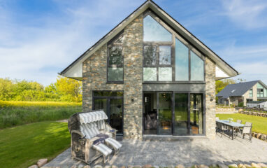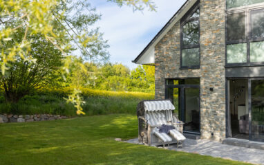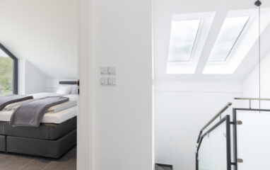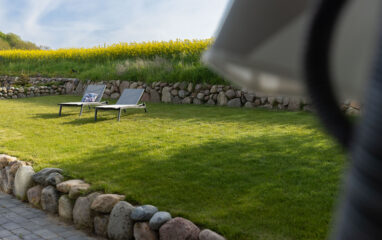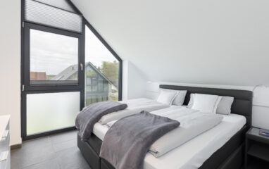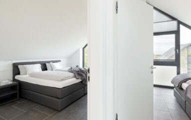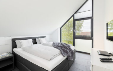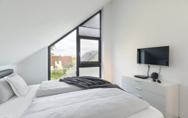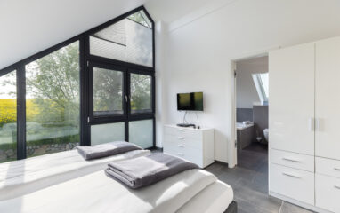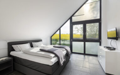 Die große bis in die Giebelspitze reichende Fensterfront lässt Sie mit Blick aufs Feld einschlafen und erholt am Morgen aufwachen.