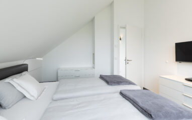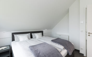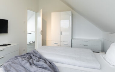 Auch dieses helle und freundliche Schlafzimmer ist mit einem bequemen Doppel-Boxspringbett eingerichtet.