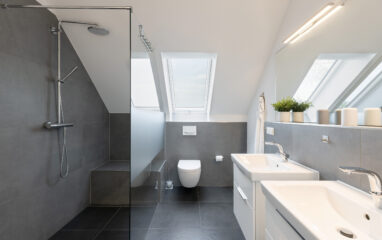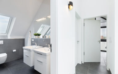 Das Bad mit 2 Waschbecken inkl. Unterbauschränken, großzügiger Badewanne, Dusche und WC bietet alle Annehmlichkeiten und ist direkt vom Schlafzimmer aus zu begehen.