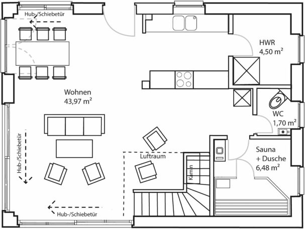 Großzügige Fensterfronten prägen diesen lichtdurchfluteten Bereich und laden am komfortablen Esstisch mit 6 sehr bequemen Stühlen zum gemeinsamen Essen und anschließenden Verweilen oder Spielen ein. Das Kaminfeuer können Sie auch von hier genießen.