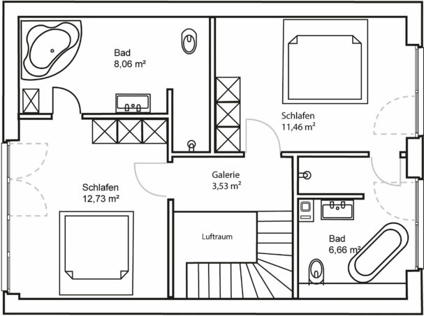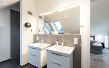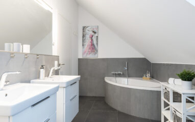 Dieses Bad mit 2 Waschbecken inkl. Unterbauschränken, großzügiger Badewanne, Dusche und WC bietet alle Annehmlichkeiten und ist direkt vom Schlafzimmer aus zu begehen.