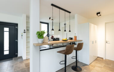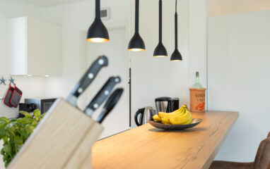 Der Küchentresen mit seinen 2 bequemen Barstühlen lädt während der Vorbereitung oder auch zwischendurch zum gemütlichen Verweilen ein.