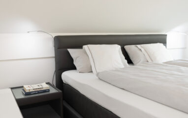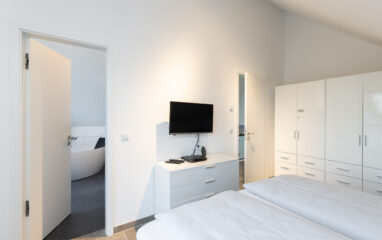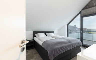 Auch dieses Schlafzimmer ist mit einem bequemen Doppel-Boxspringbett eingerichtet und das Bad direkt begehbar.