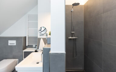 Auch hier sorgt eine Handtuchheizung für angenehm vorgewärmte Handtücher nach einer erfrischenden Dusche, ein Fön ist vorhanden.