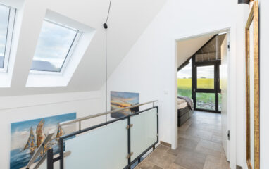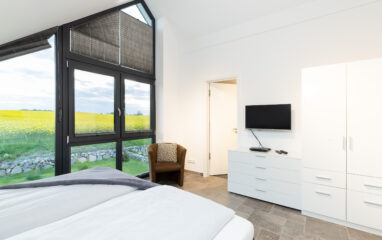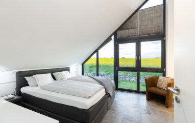 Die große bis in die Giebelspitze reichende Fensterfront lässt Sie mit Blick aufs Feld einschlafen und erholt am Morgen aufwachen. Nicht selten schaut ein Reh, friedlich äsend, vorbei - Natur pur!